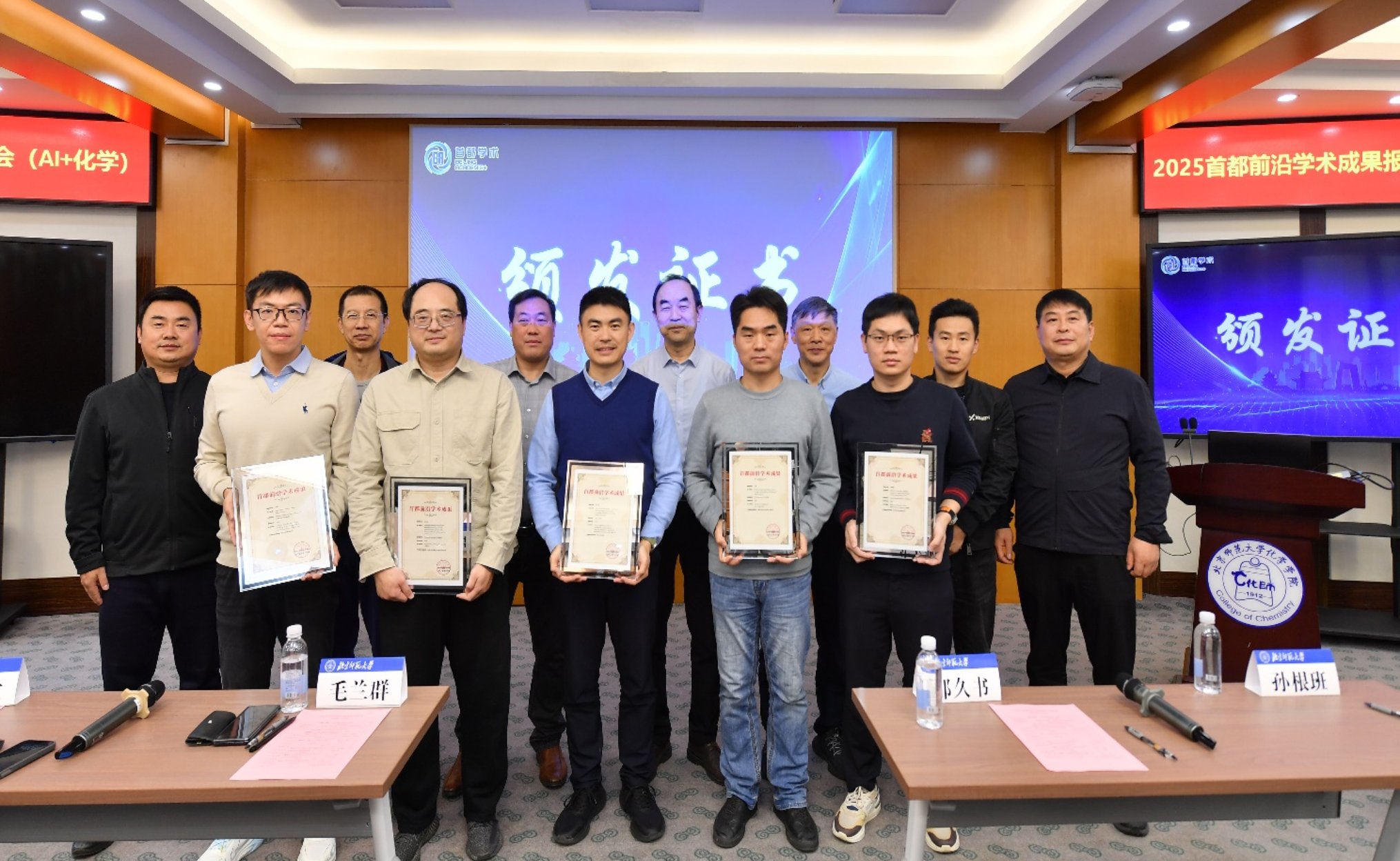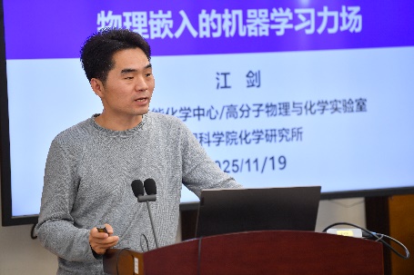 为贯彻落实党的二十大及三中、四中全会精神,促进我国高水平科技自立自强,服务北京国际科技创新中心和高水平人才高地建设,充分发挥学术交流在服务原始创新中的积极作用,2025年11月19日,首都前沿学术成果报告会(AI+化学)在北京师范大学化学楼举行。北京师范大学化学学院院长毛兰群教授,北京师范大学化学学院邵久书教授,河南大学副校长陈雪波教授,博诚经纬集团研究院院长兼首席科学家徐永龙研究员,晶泰科技有限公司多肽业务负责人张根卫博士等作为特邀专家参加交流研讨。报告会邀请中国科学院理化技术研究所林哲帅研究员,北京大学莫凡洋教授,深势科技有限公司柯国霖博士,昌平实验室张骏研究员,中国科学院化学所江剑研究员作前沿学术报告,分享AI与化学领域的高水平研究成果,深入讨论前沿技术的攻关难点。